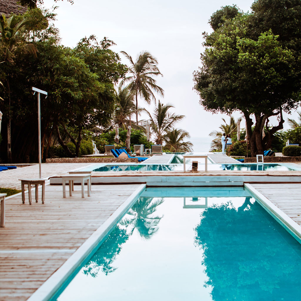 Pool deck designs range from simple platform configurations to elaborate multi-level structures that create distinct zones for different activities. Raised decks provide elevation for better views and defined spaces. Multi-level designs separate sunbathing areas from dining spaces or create graduated access to pools.